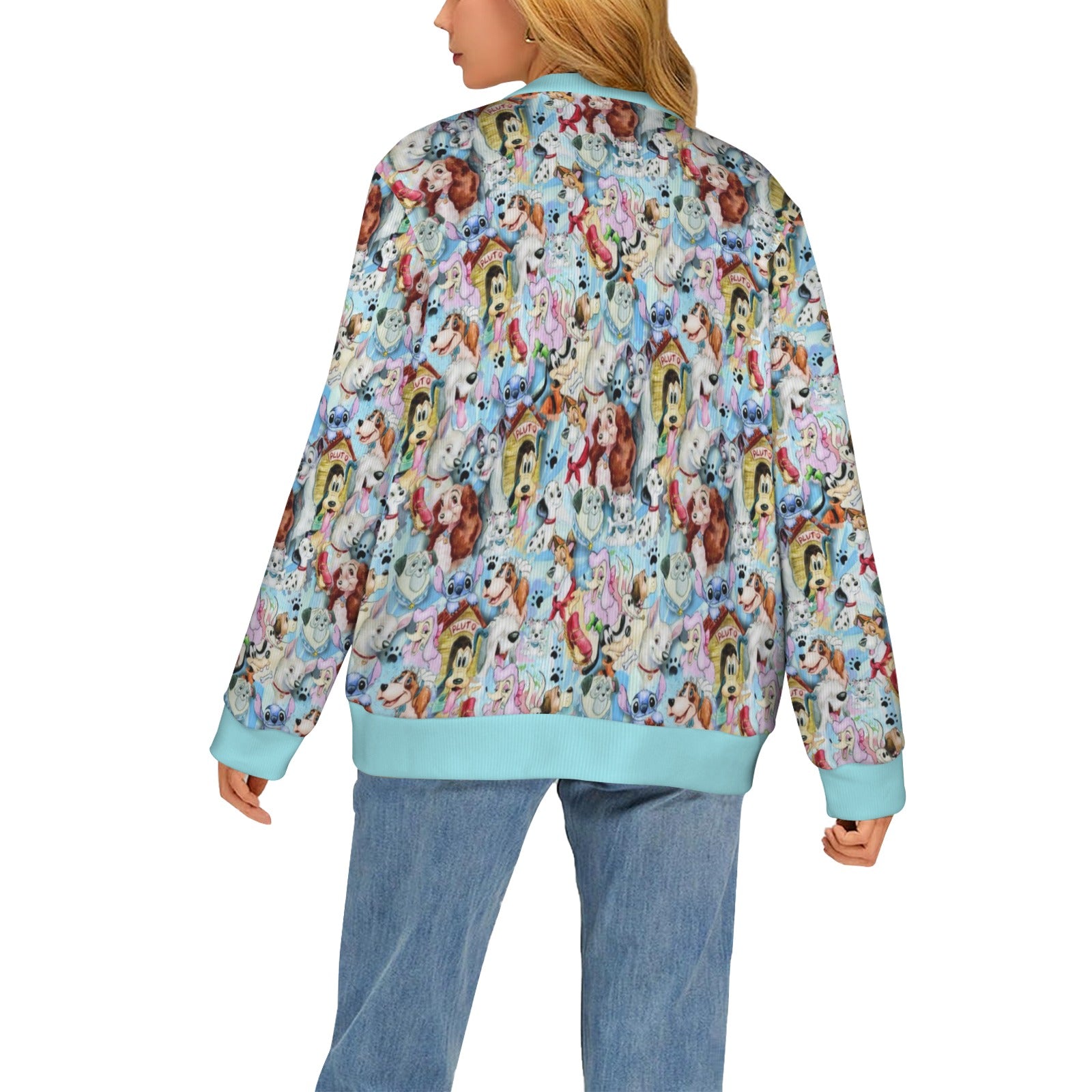 This super soft and comfortable cardigan features everyone's favourite dogs. It comes with a light blue trim and white buttons down the front. Made from 95% Polyester and 5% spandex, it's super stretchy and flattering on everyone.