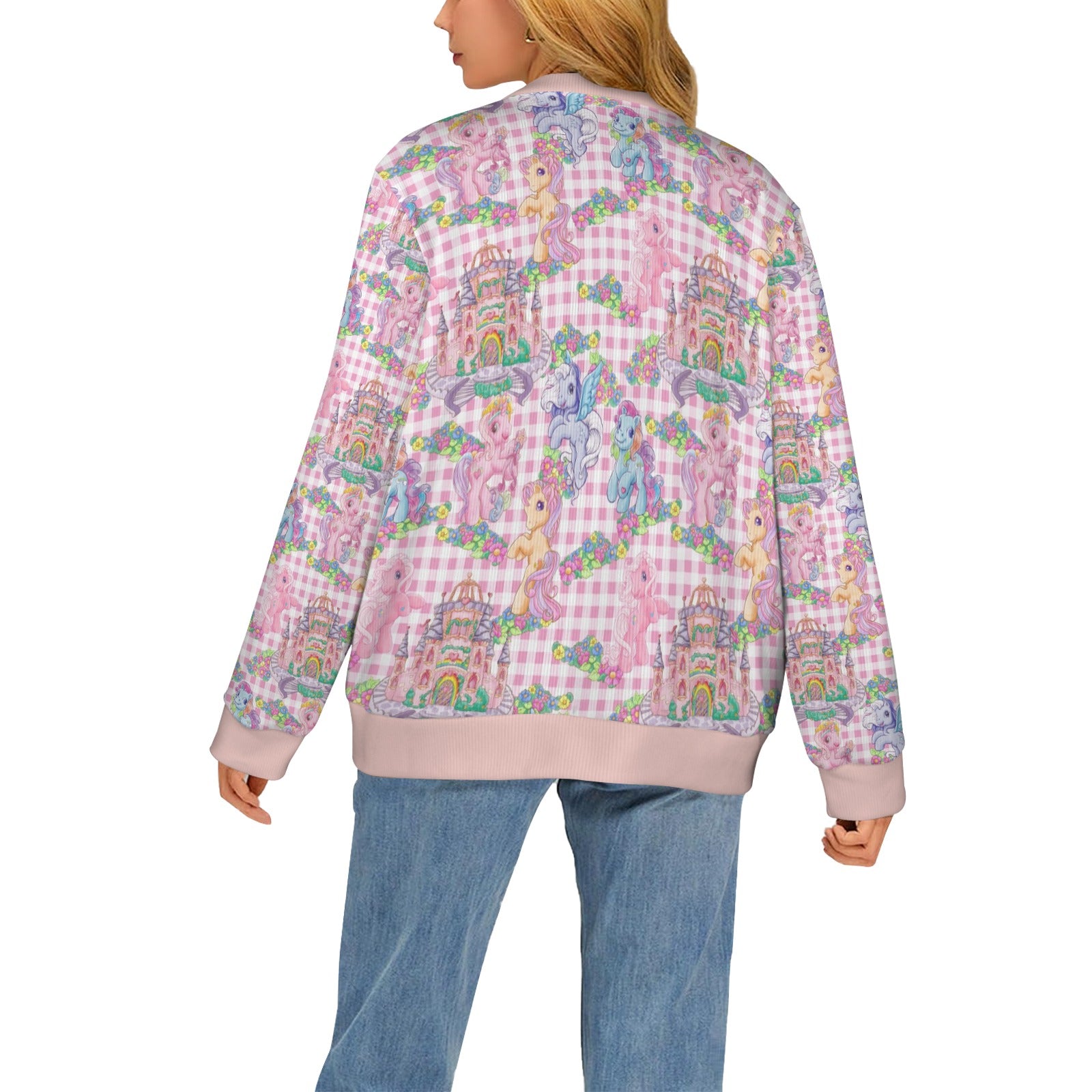 This super soft and comfortable cardigan features 80's Pony. It comes with a light pink trim and white buttons down the front. Made from 95% Polyester and 5% spandex, it's super stretchy and flattering on everyone.