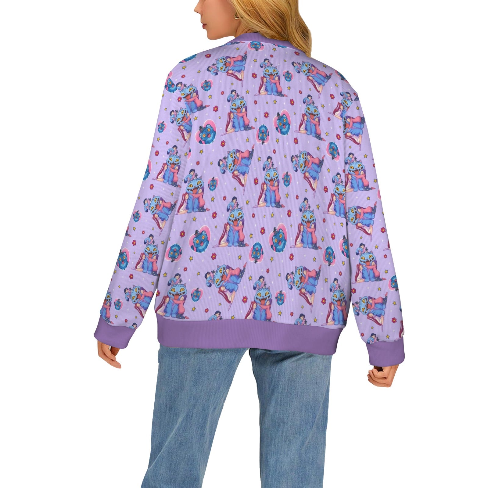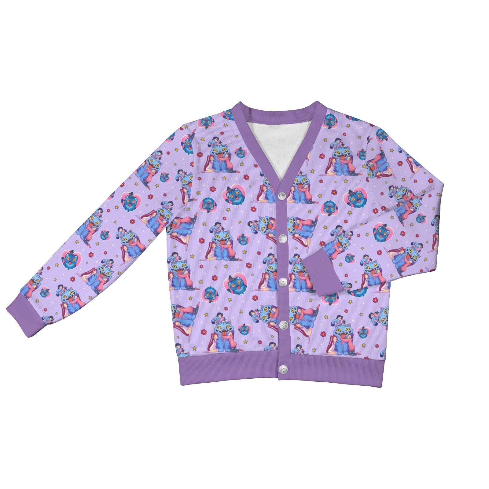 This super soft and comfortable cardigan features Derpy cat and a demon hunting pop band. It comes with a light purple trim and white buttons down the front. Made from 95% Polyester and 5% spandex, it's super stretchy and flattering on everyone.